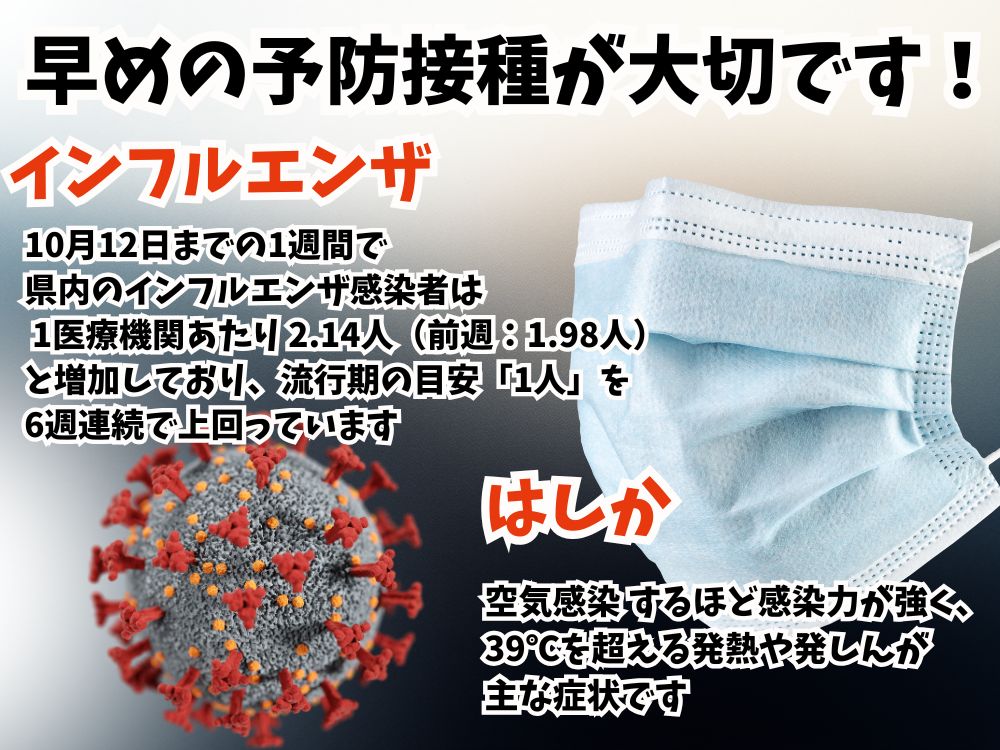 また、県内では 「はしか(麻しん)」の感染も確認 されています。 はしかは 空気感染 するほど感染力が強く、39℃を超える発熱や発しんが主な症状です。手洗いやマスクだけでは防ぎきれないため、ワクチン接種による予防が重要です。
