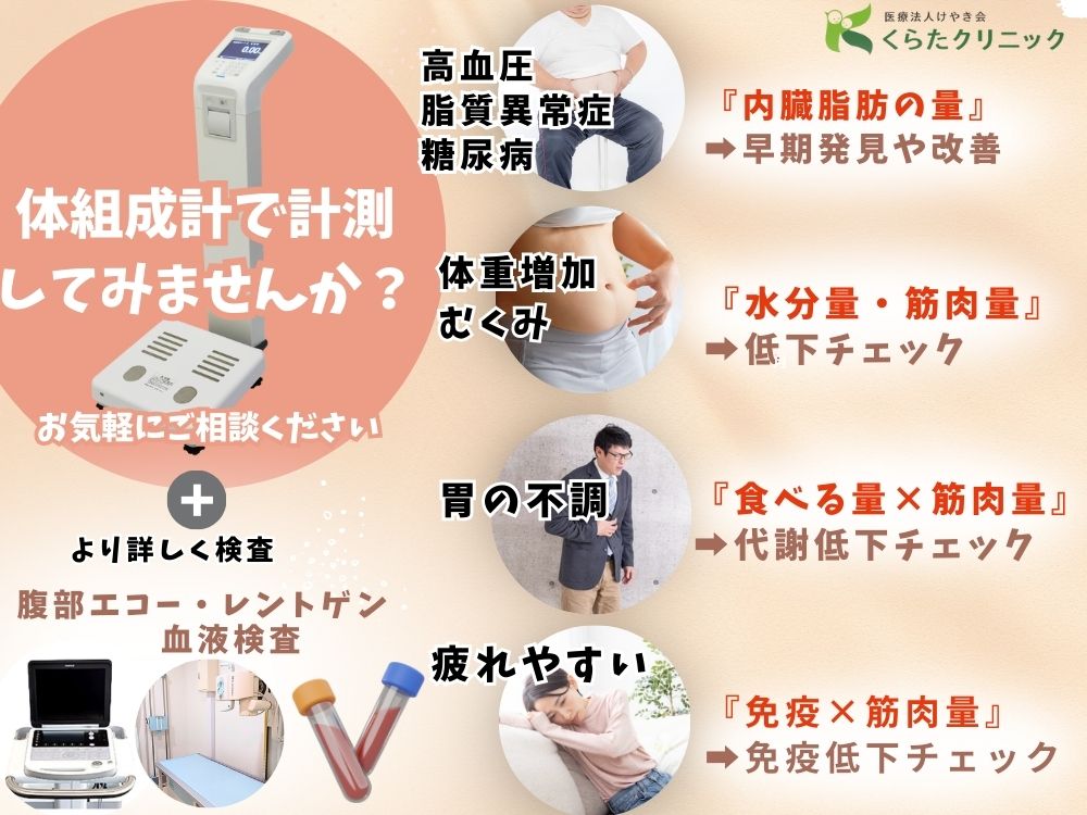などの理由から、体の中では気づかない変化が起きやすくなります。当院では、通常の診察に加えて『体組成計』による体の状態チェックが可能です。