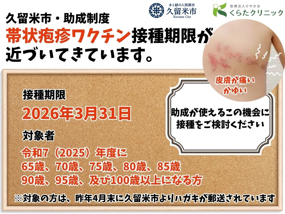 帯状疱疹ワクチン(久留米市助成)接種期限は3月31日までとなっております。
