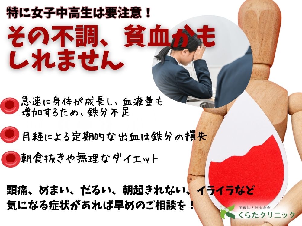 鉄不足による貧血が関係していることがあります。年齢性別に関係なく、貧血は起こり得ますが、特に女子中高生の方は、要注意です!
