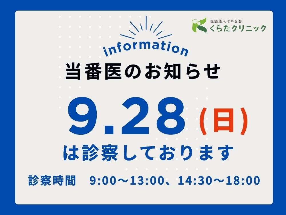 2025年9月26日(日)は、当番医のため、診察をしております。