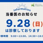 2025年9月26日(日)は、当番医のため、診察をしております。